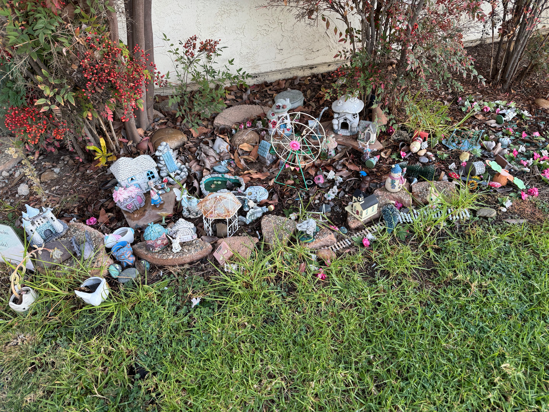 Here’s something I saw while I was walking the dog: This fairy village, which we pass by every few days. They’ve arranged it nicely since the last time I stopped to take a close look.