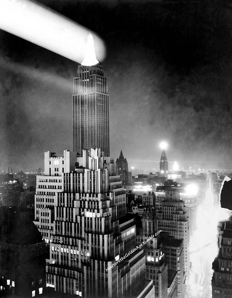 A roving searchlight illuminates the upper reaches of the Empire State Building about a month after its May 1, 1931 opening.